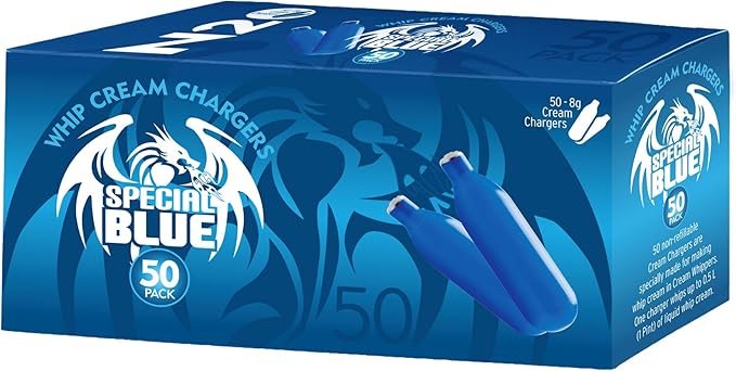 Whip up a delectable dessert topping right at home with this set of Best Whip Special blue whipped cream chargers. They feature a durable blue medical grade stainless steel construction for an extended shelf life. Super-charged with 8 grams of nitrous oxide, this set of 50 chargers conveniently fits in most whip cream dispensers. These steel cylinder chargers are ideal for producing fluffy foam to adorn your pies, fruit, and ice cream.8.5 grams
